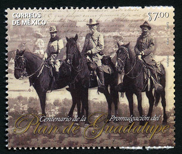 No. Scott: 2817 -- Año de Emisión: 2013 -- Valor Facial: $ 7.00 -- Multicolor -- Perforación: 13 1/4 x 13 -- Tipo de Impresión: OffsetTimbre Postal Mexicano multicolor, al fondo aparecen imágenes y personajes de la Revolución Mexicana, al frente se observan a personajes de México que participaron en la Revolución Mexicana como son: José María Pino Suárez, Venustiano Carranza y Francisco I. Madero, todos montados en caballos. Sobre la estampilla está escrito "CORREOS DE MÉXICO", el valor facial de "$7.00", "QUEZADA, TIEV, 2013" y "Centenario de la Promulgación del Plan de Guadalupe".