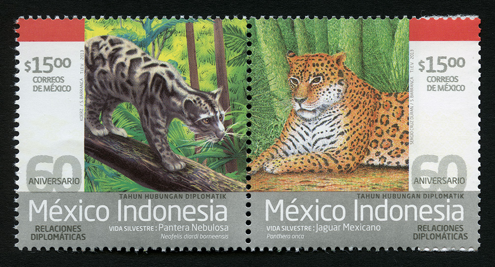 No. Scott: 2819 -- Año de Emisión: 2013 -- Valor Facial: $ 30.00 -- Multicolor -- Perforación: 13 -- Tipo de Impresión: OffsetTira de dos Timbres Postales multicolores de México, alusivos a las Relaciones Diplomáticas entre México e Indonesia, en la primera estampilla se observa a un felino llamado pantera nebulosa o leopardo longibando de gran pelaje, tiene manchas irregulares a lo largo de su cuerpo, se mueve a su antojo por los árboles apoyándose de su cola, puede llegar a medir hasta 110 cm y pesar hasta 65 kilos, en el timbre derecho aparece el jaguar mexicano, también llamado tigre de América, su aspecto general es tosco y fuerte, puede llegar a medir hasta 1:85 m de largo, su pelaje varia desde el amarillo hasta el rojizo, tiene manchas negras en forma de círculos que rodea a otra central de color claro. En cada estampilla está escrito el valor facial, "CORREOS DE MÉXICO", "60 ANIVERSARIO TAHUN HUBUNGAN DIPLOMATIC", "México-Indonesia RELACIONES DIPLOMÁTICAS", "VIDA SILVESTRE: Pantera Nebulosa y Jaguar Mexicano.