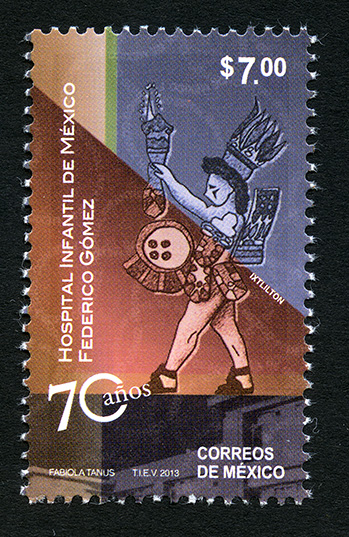 No. Scott: 2821 -- Año de Emisión: 2013 -- Valor Facial: $ 7.00 -- Multicolor -- Perforación: 13 1/4 x 13 -- Tipo de Impresión: Offset Timbre Postal Mexicano multicolor, sobre un mosaico multicolor y diversas figuras geométricas, se observa la imagen del Ixtlilton, que dentro de la mitología mexica es el Dios de la medicina, el cual tenía propiedades curativas y servía como tinta de la confección de los códices. Sobre la estampilla está escrito el valor facial de "$7.00", "70 AÑOS HOSPÍTAL INFANTIL DE MÉXICO FEDERICO GÓMEZ", "FABIOLA TANUS, TIEV, 2013" y "CORREOS DE MÉXICO". Para más información favor de dirigirse a biblioteca@mufi.org.mx