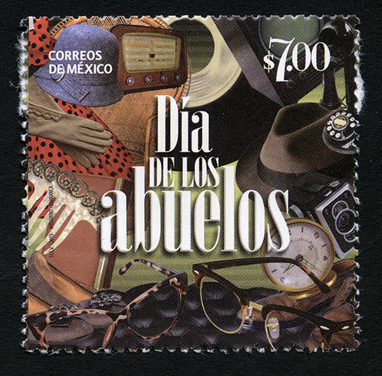 No. Scott: 2828 -- Año de Emisión: 2013 -- Valor Facial: $ 7.00 -- Multicolor -- Perforación:13 - Tipo de Impresión: Offset Timbre Postal Mexicano multicolor, en la imagen se observa un collage de objetos antiguos, tales como gorra, sombrero, guantes, collares, anteojos, relojes, teléfonos, radios, televisores y cámara fotográfica. Sobre la estampilla está escrito "CORREOS DE MÉXICO", "TIEV, 2013, "S. BARRANCA" y "Día de los abuelos". Para más información favor de dirigirse a biblioteca@mufi.org.mx