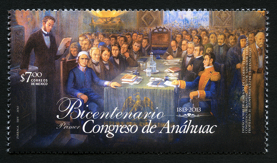 No. Scott: 2829 -- Año de Emisión: 2013 -- Valor Facial: $ 7.00 -- Multicolor -- Perforación:13 1/4 x 13 - Tipo de Impresión: OffsetTimbre Postal Mexicano multicolor conmemorando el Primer Bicentenario del Congreso de Anáhuac, en la imagen se observa el interior de una sala de juntas, alrededor aparece una multitud de personas paradas, en la escena central hay una mesa con algunos objetos sobre ella, destacando un frasco con agua y vasos, libros y hojas blancas, al contorno de la mesa hay varios hombres sentados escuchando y escribiendo, al frente y del lado izquierdo aparece un personaje de pie, leyendo un documento. Sobre la estampilla está escrito el valor facial de "$7.00", "CORREOS DE MÉXICO", el titulo y autor de la obra, "ZÁRRAGA, TIEV, 2013" y "Bicentenario Primer Congreso Anáhuac".