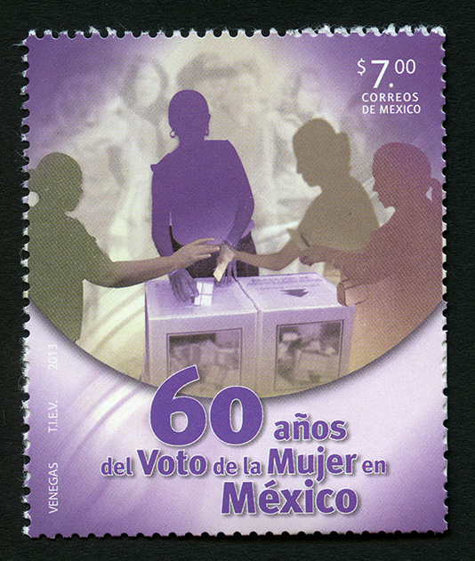 No. Scott: 2834 -- Año de Emisión: 2013 -- Valor Facial: $ 7.00 -- Multicolor -- Perforación: 13 x 13 1/4 - Tipo de Impresión: Offset Timbre Postal Mexicano multicolor, al fondo se observan siluetas humanas y al frente aparecen cuatro figuras de mujeres que están depositando sus boletas electorales en dos urnas que se observan frente a ellas. En la parte superior está escrito el valor facial de "$7.00" y "CORREOS DE MÉXICO", en la parte inferior "VENEGAS, TIEV" y "60 Años del Voto de la Mujer en México". Para más información favor de dirigirse a biblioteca@mufi.org.mx