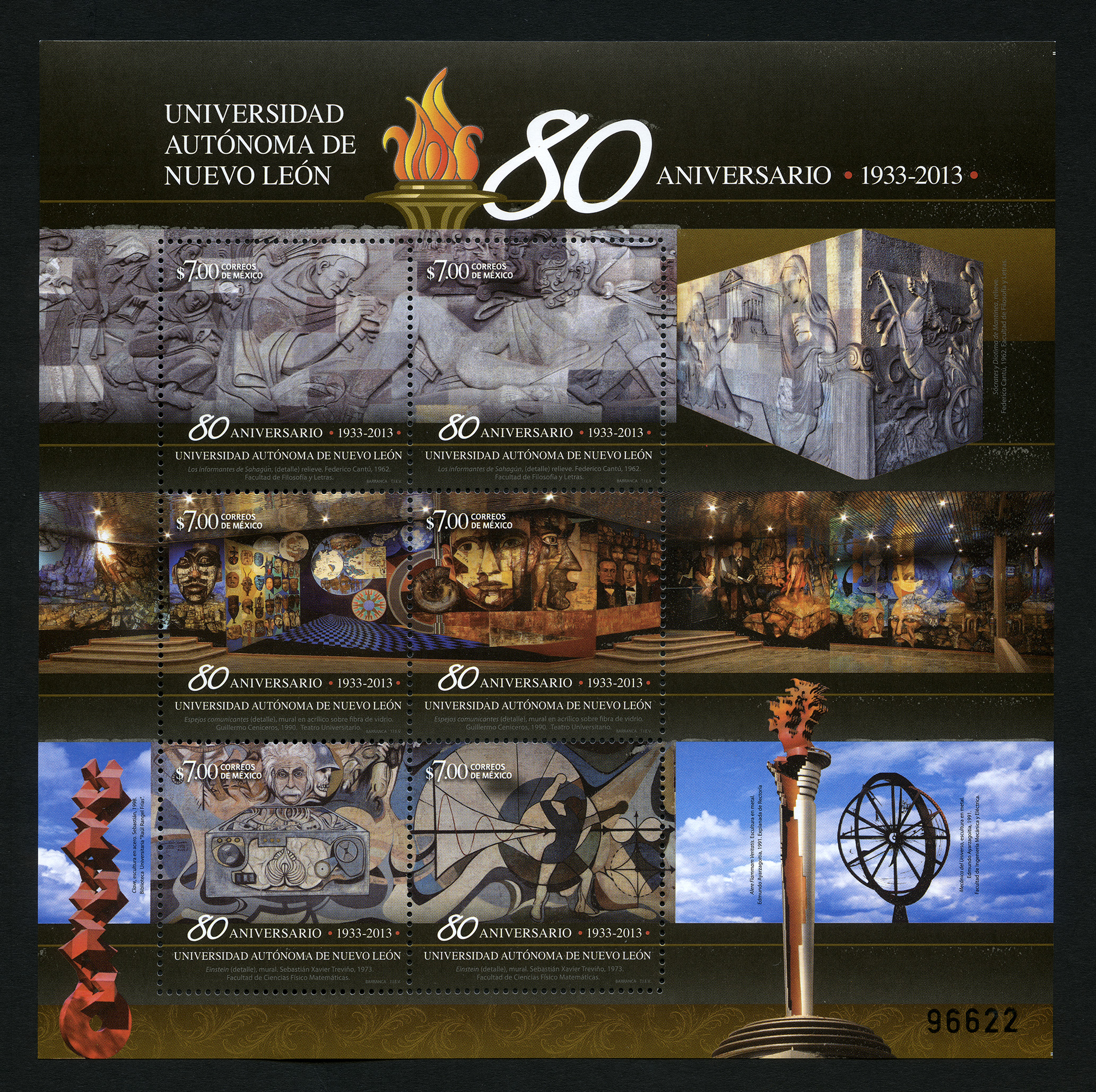 No. Scott: 2832 -- Año de Emisión: 2013 -- Valor Facial: $ 42.00 -- Multicolor -- Perforación: 13 -- Tipo de Impresión: OffsetHoja Recuerdo multicolor de México con seis Timbres Postales, conmemorando el 80 Aniversario de la Universidad Autónoma de Nuevo León, en las estampillas de arriba se observan los murales en relieve de Federico Cantú, titulados "Los Informantes de Sahagún, los cuales permanecen en la Facultad de Filosofía y Letras, en medio aparecen Los Espejos Comunicantes, mural de acrílico sobre fibra de vidrio de Guillermo Ceniceros, ubicados en el Teatro Universitarios y al final están las estampillas de Einstein, mural de Sebastián Xavier Treviño, estos se encuentra en la Facultad de Ciencias Físico Matemáticas. Es cada timbre está escrito el valor facial , "CORREOS DE MÉXICO", "80 ANIVERSARIO 1933-2013 UNIVERSIDAD AUTÓNOMA DE NUEVO LEÓN" y "BARRANCA TIEV".