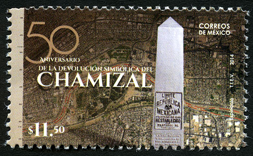 No. Scott: 2888 -- Año de Emisión: 2014 -- Valor Facial: $11.50 -- Multicolor -- Perforación: 13 x 13 1/4 -- Tipo de Impresión: OffsetTimbre Postal Mexicano multicolor, conmemorando el 50 Aniversario de la Devolución Simbólica de del Chamiza, en la imagen se observa una vista aérea de de México y Estados Unidos, en ella se observa el Parque Público Federal El Chamizal, localizado en el norte de Ciudad Juárez Chihuahua, esta área fue el único territorio que Estados Unidos le devolvió a México tras más de un siglo de disputas. En la estampilla está escrito "50 ANIVERSARIO DE LA DEVOLUCIÓN SIMBÓLICA EL CHAMIZAL", "CORREOS DE MÉXICO", "R. Espíndola TIEV, 2014" y "$11.50".