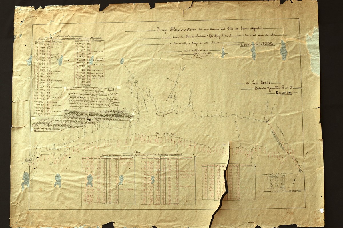Papel carcomido a lo largo del plano por presencia de hongo-gel, orillas con rupturas importantes y faltante de un fragmento a causa de hongo. Presenta además manchas de humedad y deshidratación del papel mostrándose quebradizo, de difícil manipulación