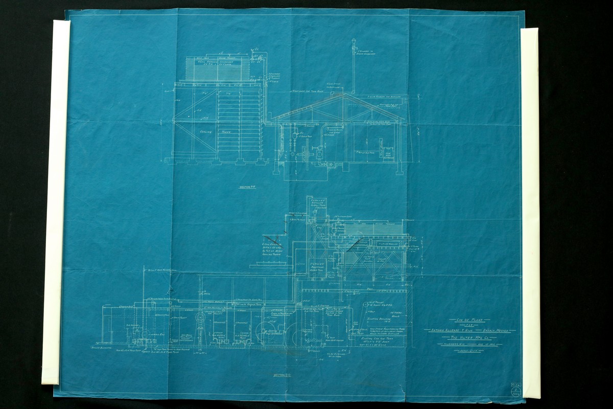 “Can ice plant”. Fábrica de hielo mostrando secciones F-F´y D-D´para el Señor Antonio Allende e hijo. Plano No. 2. Plano copia heliográfica en papel azul. Plano de lectura horizontal.Pertenece a una serie de planos. Ver no. 62 y 63.