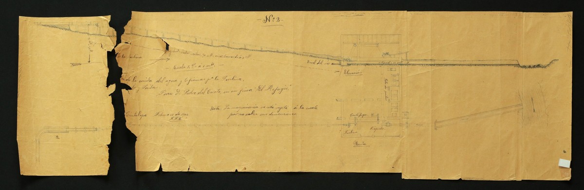 “Plano no. 2 de la caída de agua y 6 piscinas para la turbina, el trapiche y pailas / para D. Pedro del Cueto en su finca “El Refugio". Planta y elevación. Plano original en tinta sobre papel manila. Plano de lectura horizontal.Pertenece a una serie de planos. Ver nos. 54 A. IND., 55 A. IND. y 76 A. IND.