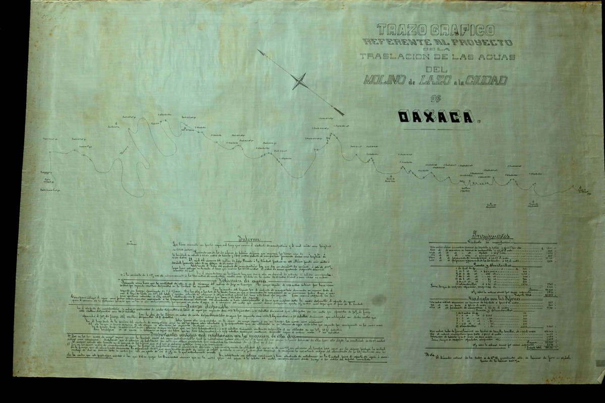 “Trazo gráfico referente al proyecto de la traslación de aguas del Molino de Lazo a la ciudad de Oaxaca / Con una longitud total de 15.68 mts. / y un viaducto de mampostería." Plano original a tinta sobre papel tela. Plano de lectura horizontal.Ver no. 58 A. IND.