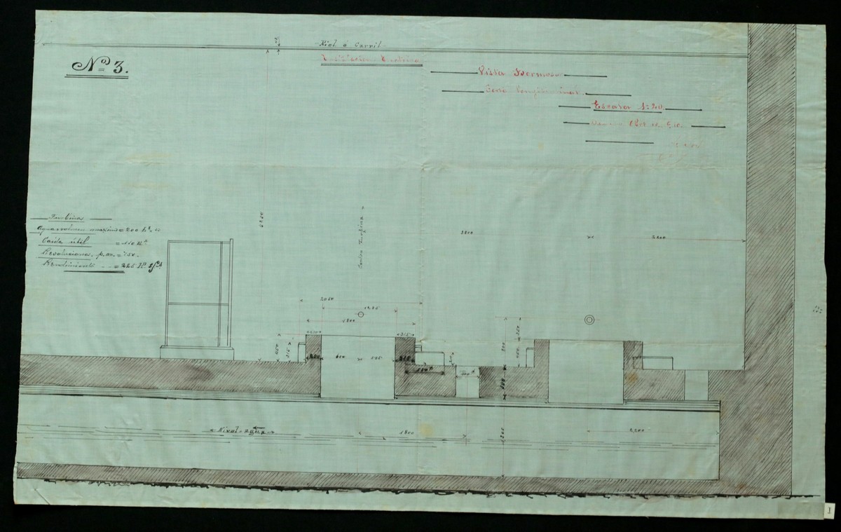 “No. 3. Instalación Eléctrica / Vista Hermosa / Corte Longitudinal / Escala 1:20”. Plano original en tinta y color sobre papel tela. Plano de lectura horizontal.Pertenece a una serie de planos. Ver no. 32 A. IND. para el No. 2 y 43 A. IND. para el No. 1.
