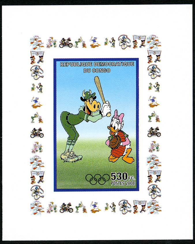 Año de emisión: 2008 -- Valor facial: 530fr -- Multicolor -- Sin perforación -- Tipo de Impresión: Litografía.Hoja recuerdo imperforado con un marco de diferentes personajes de la serie animada de Mickey Mouse. Se encuentra en la estampilla la ilustración de dos personajes de la serie popular de Disney, el personaje animado Clara bella tiene una vestimenta deportiva de color verde y de calzado unos spikers, en sus manos sostiene un bate, incluye la estampilla "REPUBLIQUE DEMOCRATIQUE DU CONGO", año de emisión "POSTES 2008", valor facial "530FC" y los anillos olímpicos, símbolo de los Juegos Olímpicos.