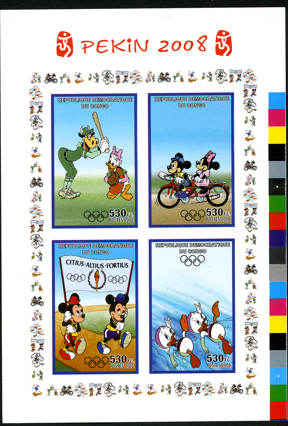 Año de emisión: 2008 -- Valor facial: 530fr -- Multicolor -- Sin perforación -- Tipo de Impresión: Litografía.Los Juegos Olímpicos de Pekín 2008 se realizaron en la capital de la República Popular China con una participación estimada de 10,000 atletas destacados, la serie animada y popular de la compañía Disney se encuentra representada con la ilustración de los personajes de la serie de Mickey Mouse en un bloque imperforado de cuatro estampillas con linea de prueba de impresión vertical. En la primera estampilla el personaje animado Clara bella tiene colocado una vestimenta deportiva de color verde y de calzado unos spikers, en sus manos sostiene un bate, el personaje de la Pata Daisy tiene en su pecho un accesorio llamado peto y la manopla se encuentra en sus ambas manos, la siguiente estampilla incluye a dos personajes muy populares "Mickey Mouse" y su novia "Minnie Mouse" ambos pedaleando una bicicleta, la tercera estampilla se encuentra nuevamente a "Mickey Mouse y Minnie Mouse", la cuarta estampilla representando el deporte de natación con los "Hermanos Duck". Cada estampilla incluye el país emisor "REPUBLIQUE DEMOCRATIQUE DU CONGO", año de emisión "POSTES 2008" y valor facial "530FC".