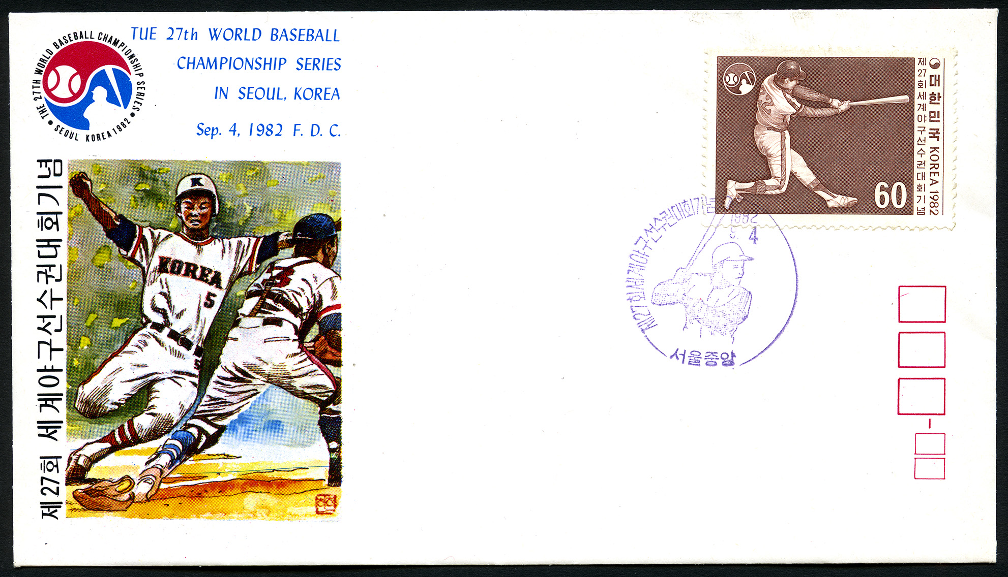 No. Scott: 1311 -- Año de emisión: 1982 -- Valor facial: 60w -- Rojo y marrón -- Con perforación: 13 -- Tipo de impresión: Grabado.Sobre de Primer Día de emisión con ilustración de un corredor tratando de llegar a home y el receptor mantiene una postura de resguardo con el pie izquierdo en el plato, el sobre contiene alfabeto coreano, escritura en inglés con el tema "THE 27th WORLD BASEBALL CHAMPIONSHIP SERIES IN SEOUL, KOREA - sep. 4, 1982, F. D. C. y el logo del tema celebrado en parte superior izquierdo. Parte superior lado derecho se encuentra un sello en tinta azul y estampilla conmemorativa con fondo color rojo y marrón, un bateador se encuentra ejecutando un swing, cuenta con casco de protección, camisola blanca, pantalón blanco y spikes blancos. La estampilla contiene alfabeto coreano, país emisor "KOREA", año de emisión "1982" y valor facial "60".