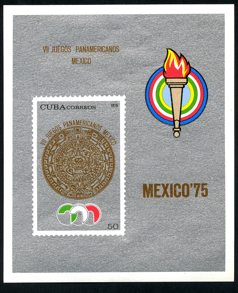 No. Scott: 2002 -- Año de emisión: 1975 -- Valor facial: 50c -- Multicolor -- Sin perforación -- Tipo de Impresión: Litografía. Hoja recuerdo con fondo color gris, se encuentra el diseño de una llama olímpica, símbolo de un regalo por parte del titán Prometeo para la humanidad y en cada evento multideportivo se hace presente la manifestación visible de una llama resguardada en una antorcha. La hoja recuerdo incluye una estampilla imperforada con la ilustración del calendario solar, una representación del tiempo del México antiguo en la época de las civilizaciones de Mesoamérica. La estampilla incluye el país emisor "CUBA", valor facial "50" y el motivo de emisión "VII JUEGOS PANAMERICANOS MÉXICO". Para más información favor de dirigirse a biblioteca@mufi.org.mx.