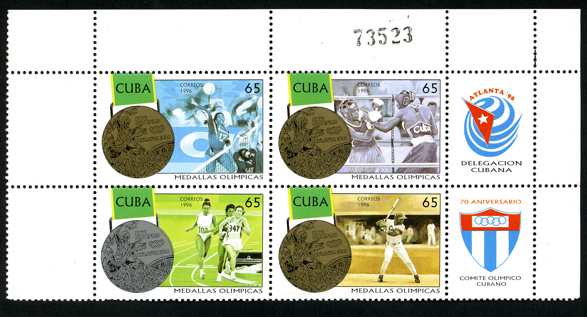 No. Scott: 3787 -- Año de emisión: 1996 -- Valor facial: 65c -- Multicolor -- Con perforación: 12 1/2 -- Tipo de Impresión: Litografía. Bloque de cuatro estampillas más etiqueta en el borde derecho, resaltando los escudos oficiales de la Delegación Cubana y el Comité Olímpico Cubano, se aprecian cuatro estampillas con la ilustración de una medalla otorgada a la disciplina deportiva ganadora y la medalla de oro fue otorgada al deporte de beisbol. Cada estampilla contiene el valor facial "65", país emisor "CUBA", año de emisión "1996" y motivo de emisión "MEDALLAS OLÍMPICAS". Para más información favor de dirigirse a biblioteca@mufi.org.mx.