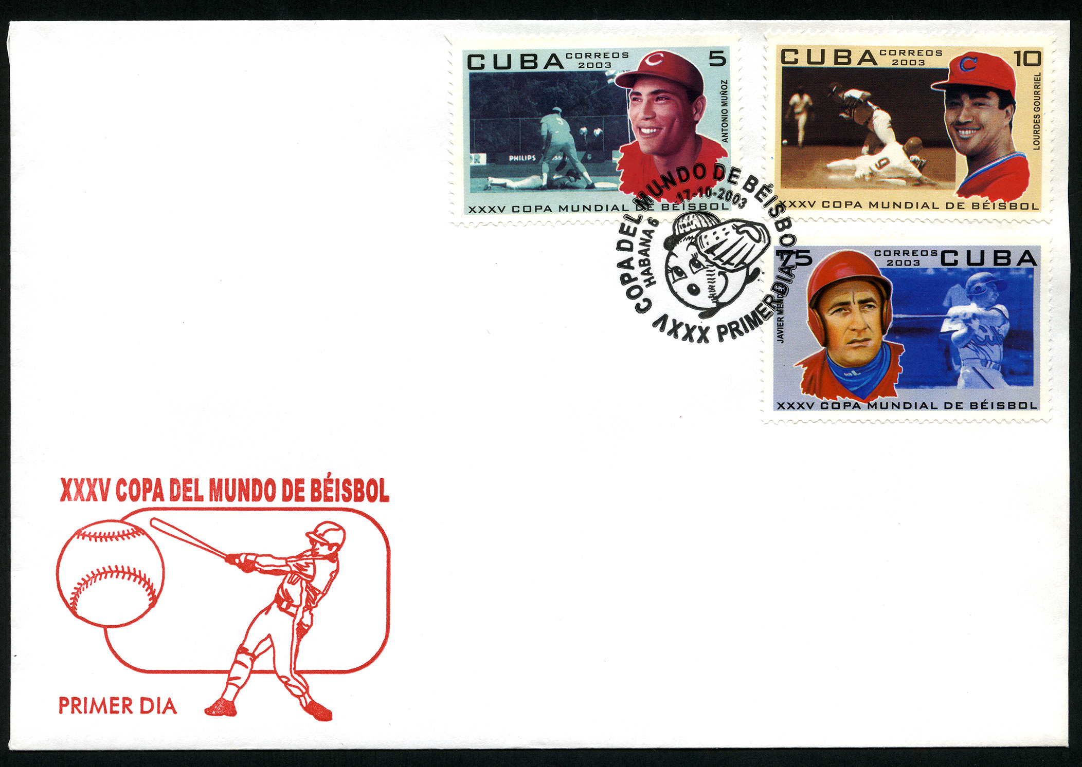 No. Scott: 4348, 4349, 4352 -- Año de emisión: 2003 -- Valor facial: 5, 10, 75 -- Multicolor -- Con perforación: 12 1/2 x 12 1/4 -- Tipo de Impresión: Litografía.Sobre de Primer Día de emisión, con ilustración de un bateador realizando un swing y una pelota elevándose, se encuentra escrito "XXXV COPA DEL MUNDO DE BEISBOL - PRIMER DÍA". En la parte superior lado derecho se encuentran las emisiones del tema "XXXV COPA MUNDIAL DE BEISBOL", comenzando por el jugador Antonio Muñoz Hernández. Primer jugador en la historia de la Serie Nacional que ha llegado a 300 jonrones, fue acreedor de ocho títulos de jonrones, líder del beisbol cubano de todos los tiempos en bases por bolas, jugó cuatro décadas en Cuba entre 1960-1990 y fue seleccionado por el pueblo entre los 100 mejores atletas cubanos del siglo XX. La segunda estampilla contiene el diseño de Lourdes Gourriel Delgado, nació en 1957 en la provincia de Santi Spíritus. Participó en los Juegos Panamericanos de 1982, 1986, 1990, y 1993. Después de su retiro, dirigió el equipo de Santi Spíritus más exitoso de la Serie Nacional de Beisbol en Cuba y la tercera estampilla es el jugador Javier Méndez, como tercer bate, estableció promedio de 328 con más de dos mil hits y 296 jonrones conectados, de estos 19 en el último campeonato en que participó, más que en ninguna otra ocasión anterior. En 1986 quedaría líder de los bateadores con un astronómico promedio de 408, producto de 53 sencillos en 130 oportunidades. En cada estampilla se encuentra el motivo de emisión "XXXV COPA MUNDIAL DE BEISBOL, valor facial y país emisor "CUBA".
