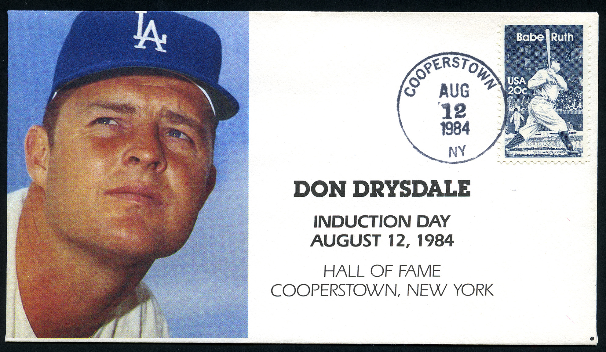 No. Scott: 2046 -- Año de emisión: 1983 -- Valor facial: 20c -- Multicolor -- Con perforación: 11 x 10 1/2 -- Tipo de Impresión: Fotograbado.Sobre de Primer Día de emisión con sello de cancelación e ilustración de Donald Scott Drysdale fue un jugador de béisbol profesional estadounidense. Lanzador diestro de los Dodgers de Brooklyn, Los Ángeles. Donald Drysdale fue incluido en el Salón de la Fama del Beisbol en el año de 1984. La estampilla impregnada en el sobre es del beisbolista que obtuvo un total de siete mundiales ganados, apodado como "Babe" y jugó en la posición de outfielder en los Yankees de Nueva York en la Liga Americana. La estampilla contiene, valor facial: 20c, motivo de emisión: Babe Ruth y país emisor: Estados Unidos.