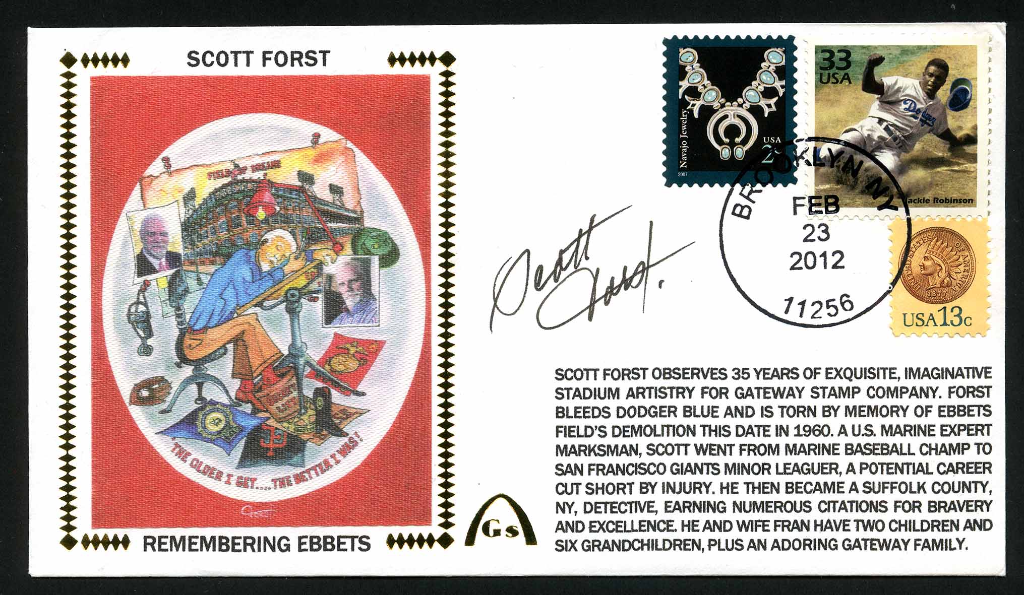 No. Scott: 1734, 3186c, 3753 -- Año de emisión: 1978, 1999, 2007 -- Valor facial: 13c, 33c, 2c -- Multicolor -- Con perforación: 11 1/2 -- Tipo de Impresión: Rebaje, Litografía, Litografía. Sobre con sello de cancelación, ilustración sobre tela de Scott Forst y tres timbre a: ) Timbre de la serie "Conmemorando el Siglo", de Jackie Robinson. Para más información favor de dirigirse a biblioteca@mufi.org.mx.