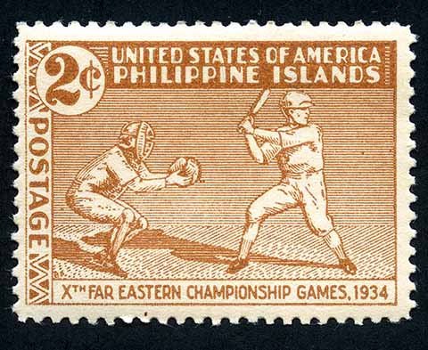 No. Scott: 380 -- Año de emisión: 1934 -- Valor facial: 2c -- Multicolor -- Con perforación: 11 1/2 -- Tipo de Impresión: Tipografía. Timbre conmemorativo con imagen de jugadores de beisbol. El primer timbre relativo al beisbol fue emitido por Filipinas en 1934 para conmemorar el Décimo Campeonato de los Juegos del Lejano Este, un tipó de olimpiada regional. La serie incluia tres estampillas relativas al deporte: beisbol, tenis y basquetbol. Para más información favor de dirigirse a biblioteca@mufi.org.mx.