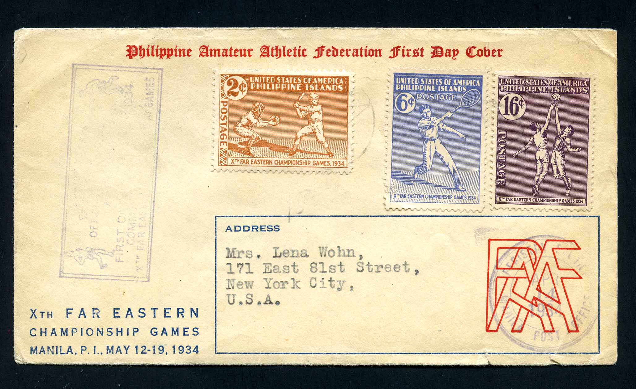 No. Scott: 380, 381, 382 -- Año de emisión: 1934 -- Valor facial: 2c, 6c, 16c -- Multicolor -- Con perforación: 11 1/2 -- Tipo de Impresión: Tipografía. Sobre de Primer Día de emisión con sello de cancelación, destinatario y tres timbres de la serie: a) Beisbolistas; b) Tenista; y c) Basquetbolistas. Para más información favor de dirigirse a biblioteca@mufi.org.mx.