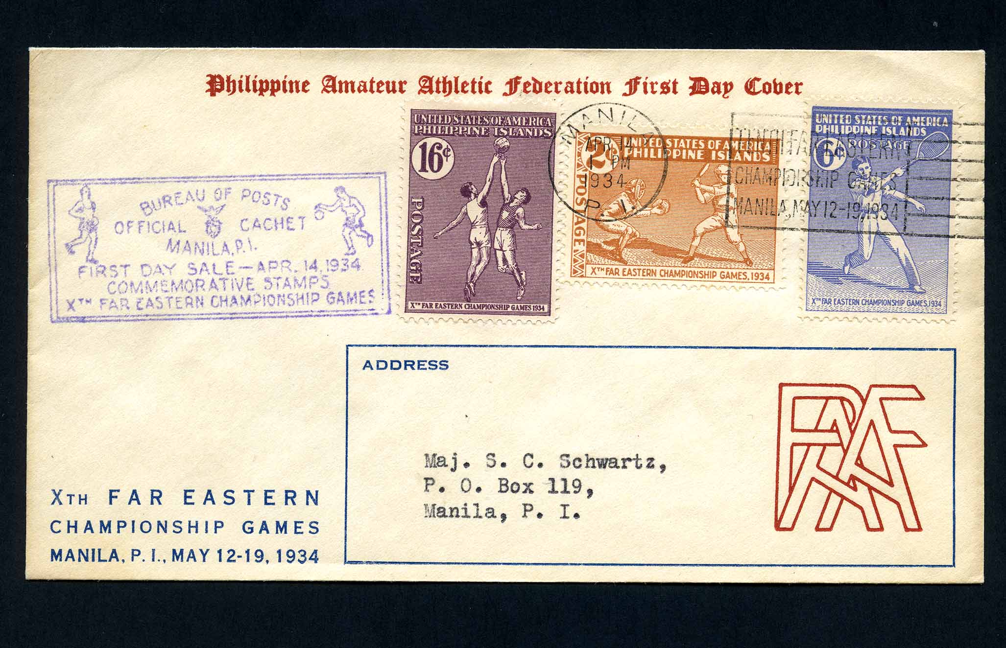 No. Scott: 380, 381, 382 -- Año de emisión: 1934 -- Valor facial: 2c, 6c, 16c -- Multicolor -- Con perforación: 11 1/2 -- Tipo de Impresión: Tipografía. Sobre de Primer Día de emisión con sello de cancelación, destinatario y cuatro timbres de la serie: a) Tenista; b) Basquetbolista; c) y d) Beisbolista. Para más información favor de dirigirse a biblioteca@mufi.org.mx.