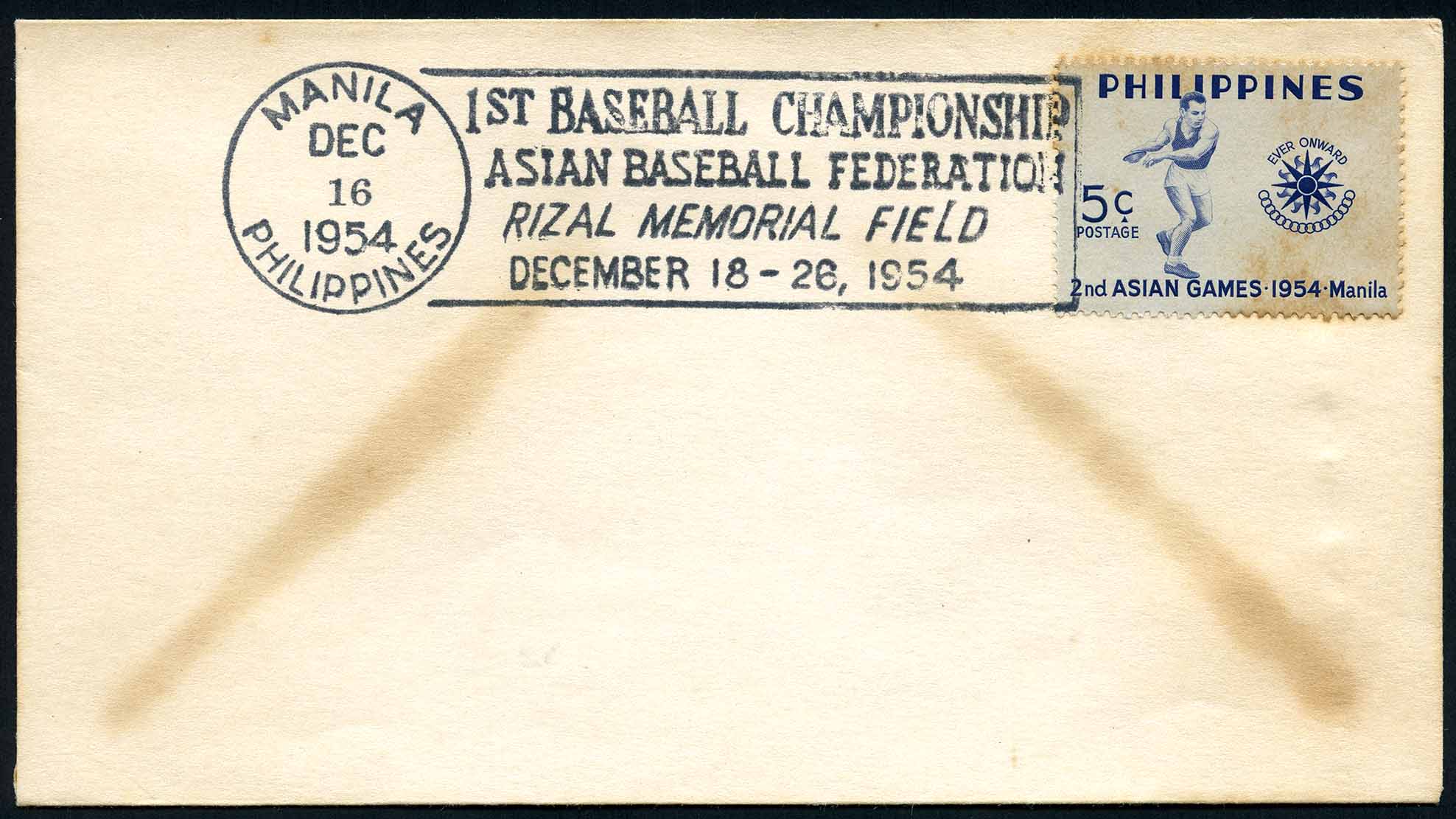 No. Scott: 610 -- Año de emisión: 1954 -- Valor facial: 5c -- Multicolor -- Con perforación: 11 1/2 -- Tipo de Impresión: Tipografía. Sobre con sello de cancelación del Primer Campeonato de Beisbol de la Federación de Beisbol Asiático, y timbre de un lanzador de disco. Para más información favor de dirigirse a biblioteca@mufi.org.mx.