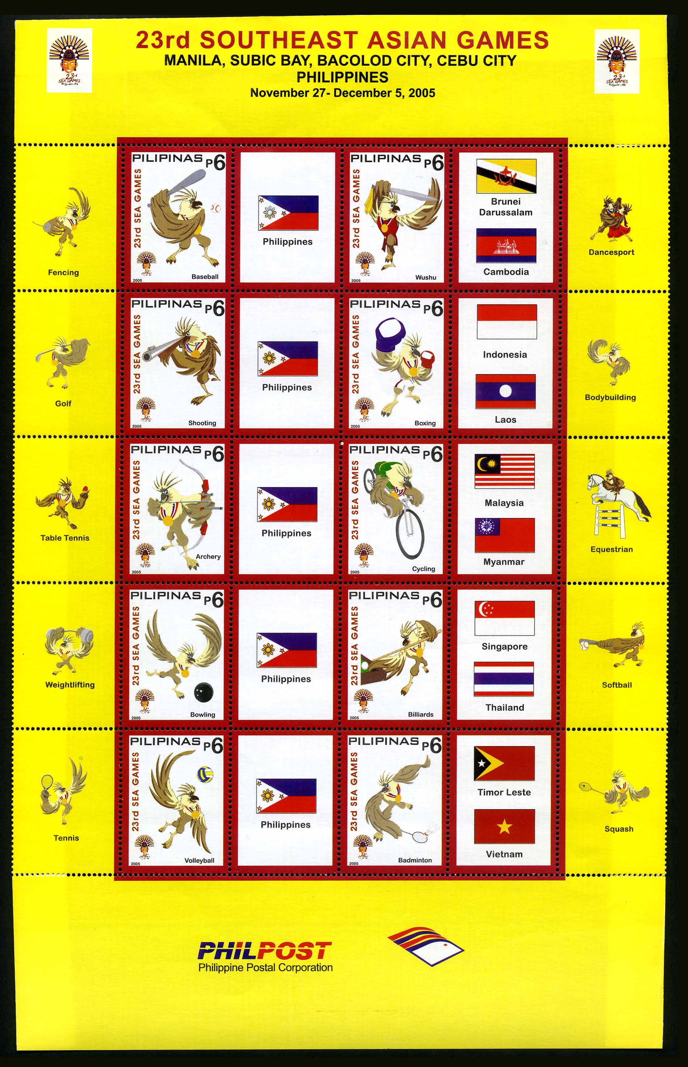 No. Scott: 2992 -- Año de emisión: 2005 -- Valor facial: 6p -- Multicolor -- Con perforación: 11 1/2 -- Tipo de Impresión: Tipografía. Min planilla de diez timbres con imagen de una águila como la mascota de los juegos, representando diferentes deportes, entre ellos el beisbol y b) veinte cenicientas con diferentes banderas, alrededor la mascota representando otros deportes. Para más información favor de dirigirse a biblioteca@mufi.org.mx.