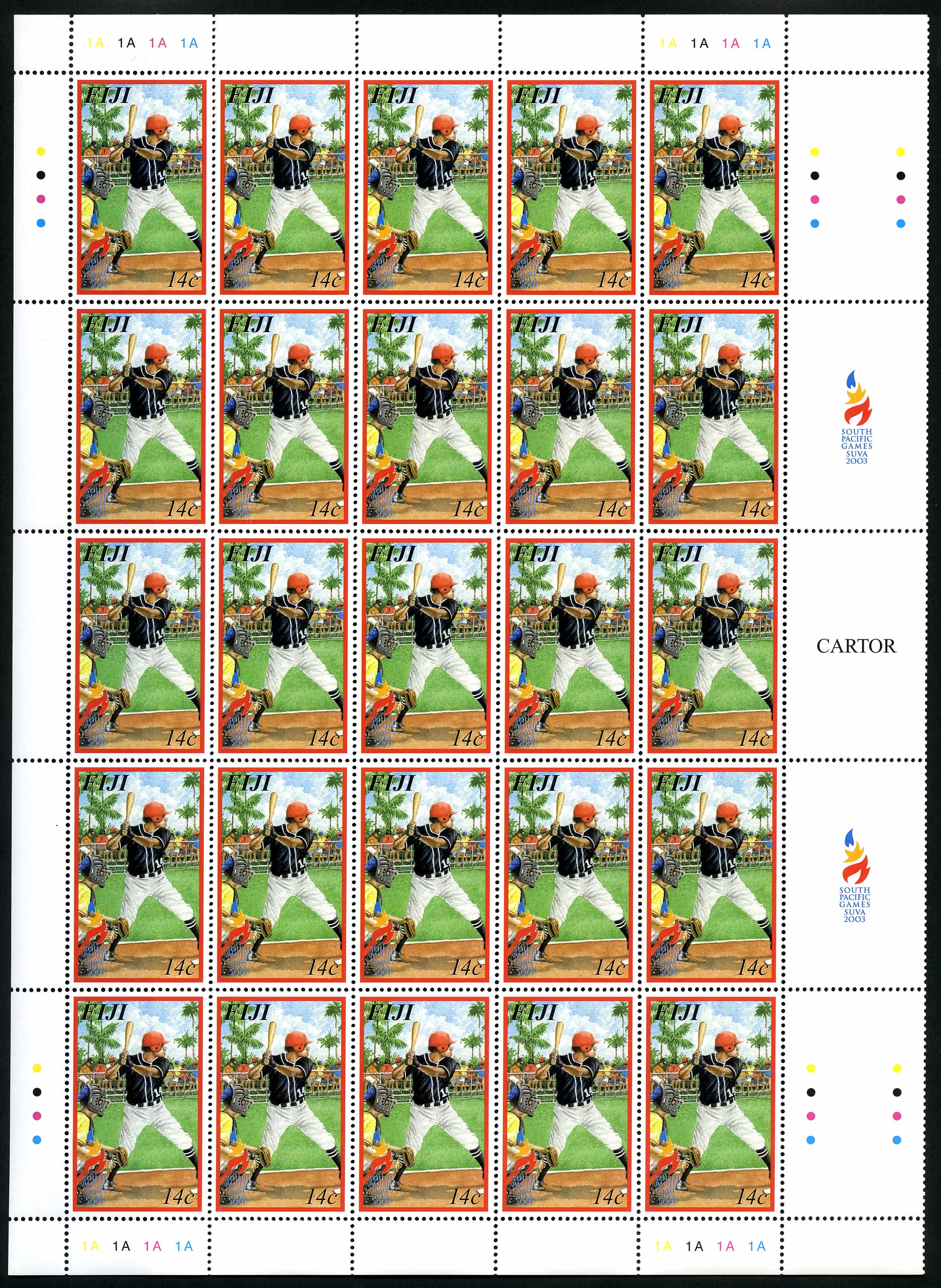 No. Scott: 981 -- Año de emisión: 2003 -- Valor facial: 14c -- Multicolor -- Con perforación: 13 1/4 -- Tipo de Impresión: Litografía. Planilla de veinticinco timbres e imagen de jugador de beisbol vistiendo con uniforme negro y blanco. Para más información favor de dirigirse a biblioteca@mufi.org.mx.