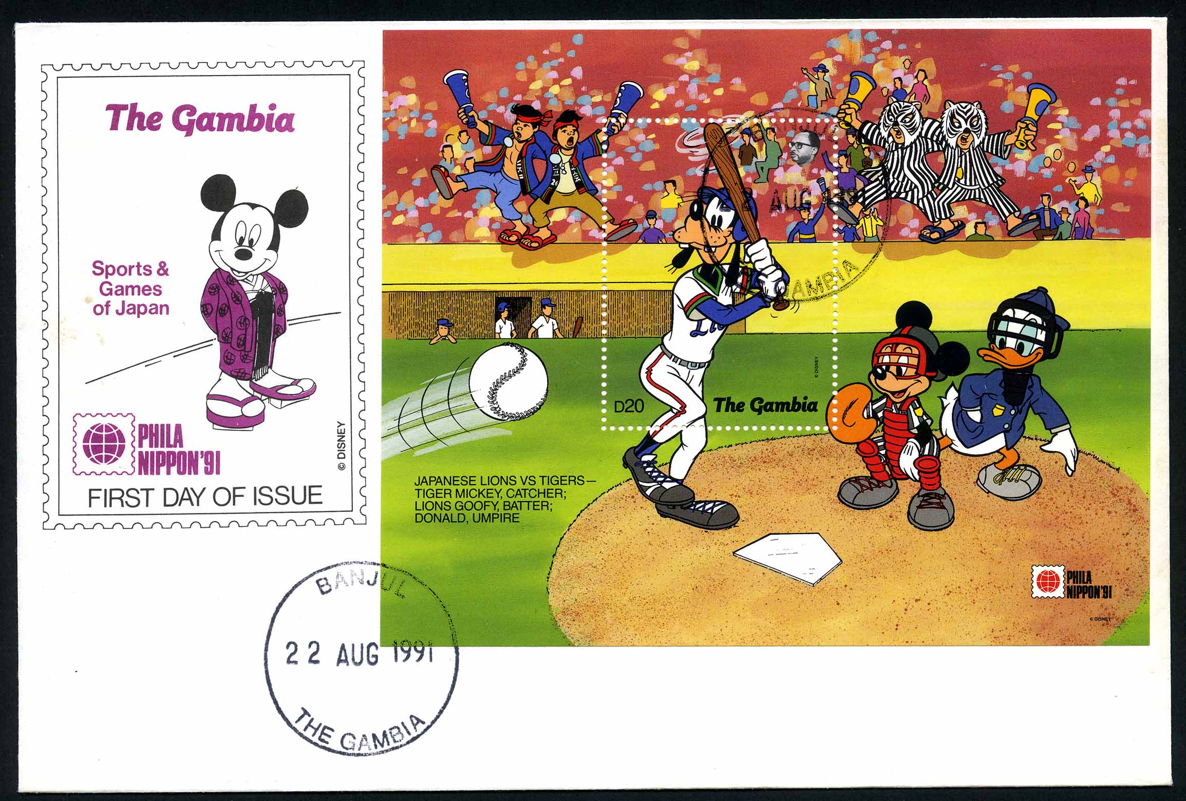 No. Scott: No listado -- Año de emisión: 1991 -- Valor facial: 20d -- Multicolor -- Con perforación: 13 1/4 -- Tipo de Impresión: Litografía. Sobre de Primer Día de emisión con timbre con imagen de Mickey Mouse y con Hoja recuerdo, imagen de Goofy, Mickey Mouse y el Pato Donald jugando beisbol. Para más información favor de dirigirse a biblioteca@mufi.org.mx.