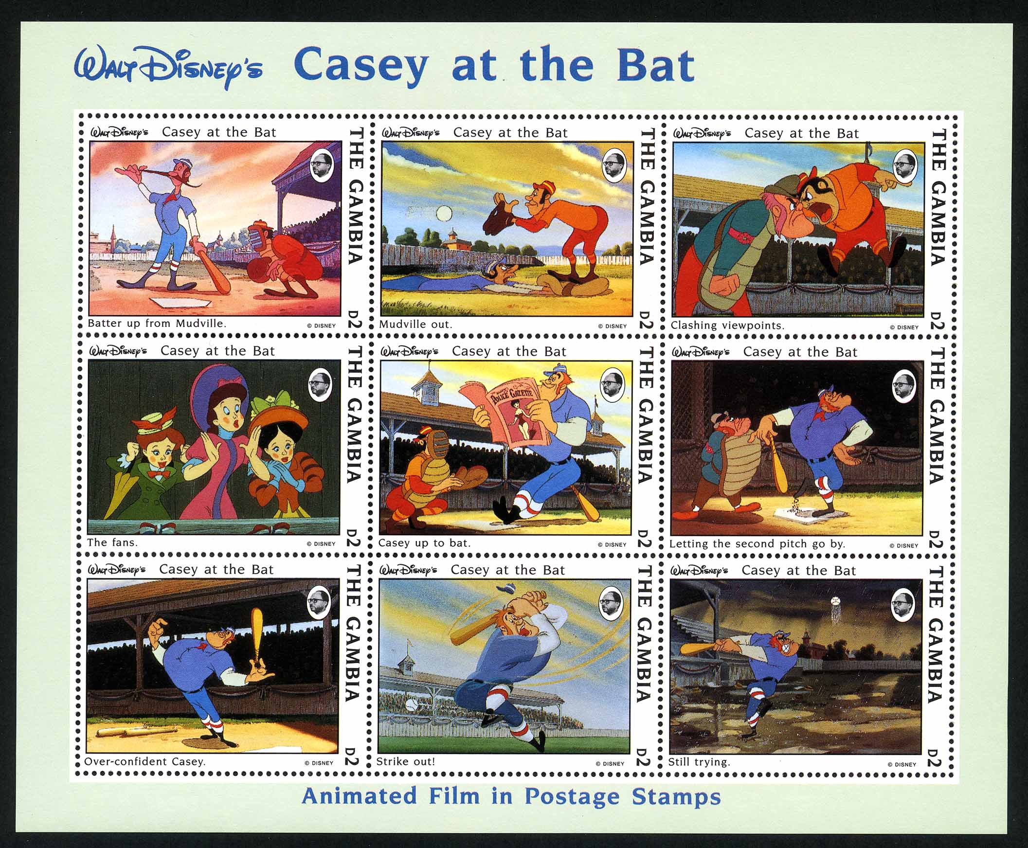 No. Scott: 1441 -- Año de emisión: 1993 -- Valor facial: 2d -- Multicolor -- Con perforación: 13 1/4 -- Tipo de Impresión: Litografía. Bloque de nueve timbres perforados con imagenes de la versión de Disney del poema sobre el bateador de béisbol Casey, y su valiente posición para tratar de ganar el juego para Mudville. Para más información favor de dirigirse a biblioteca@mufi.org.mx.