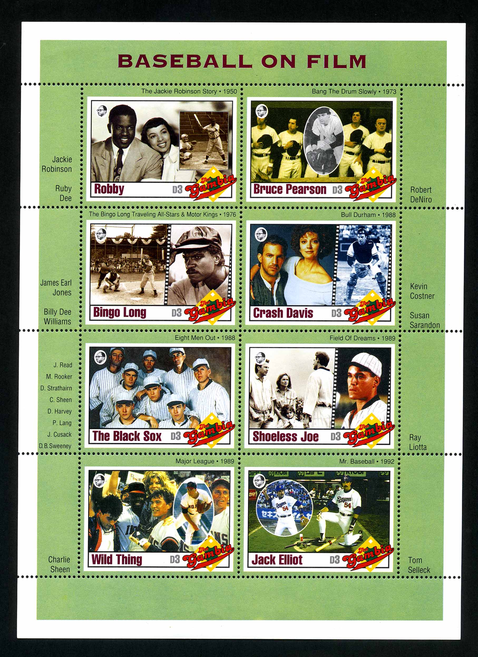 No. Scott: 1348 -- Año de emisión: 1993 -- Valor facial: 24d -- Multicolor -- Con perforación: 13 1/4 -- Tipo de Impresión: Litografía.Mini planilla de ocho timbres con bandera impresa. Película y estrellas: La Historia de Jackie Robinson, 1950, Jackie Robinson y Ruby Dee; b) Muerte de un jugador, 1973, Robert De Niro; c) The Bingo Long Traveling All - Stars, Motor Kings, 1976, James Earl Jones y Billy Dee Williams; d) Los Búfalos de Durham, 1988, Kevin Costner y Susan Sarandon; e) Ocho hombres fuera, 1988, J. Read, M. Rooker, D. Strathairn, C. Sheen, D. Harvey, P. Lang, J. Cusack y D. B. Sweeney; f) Campo de sueños, 1989. Ray Liotta; g) Grandes Ligas, 1989, Charlie Sheen; h) Sr. Beisbol, 1922. Tom Selleck.