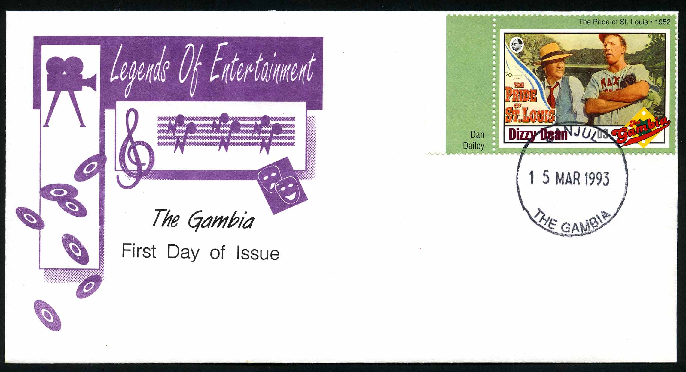 No. Scott: 1348g -- Año de emisión: 1993 -- Valor facial: 3d -- Multicolor -- Con perforación: 13 1/4 -- Tipo de Impresión: Litografía. Gambia, 1993. El Beisbol en las películas Leyendas del entretenimiento. Sobre de Primer Día deemisión con sello de cancelación y timbre "El orgullo de St. Louis. 1952, con Dan Dailey". Para más información favor de dirigirse a biblioteca@mufi.org.mx.