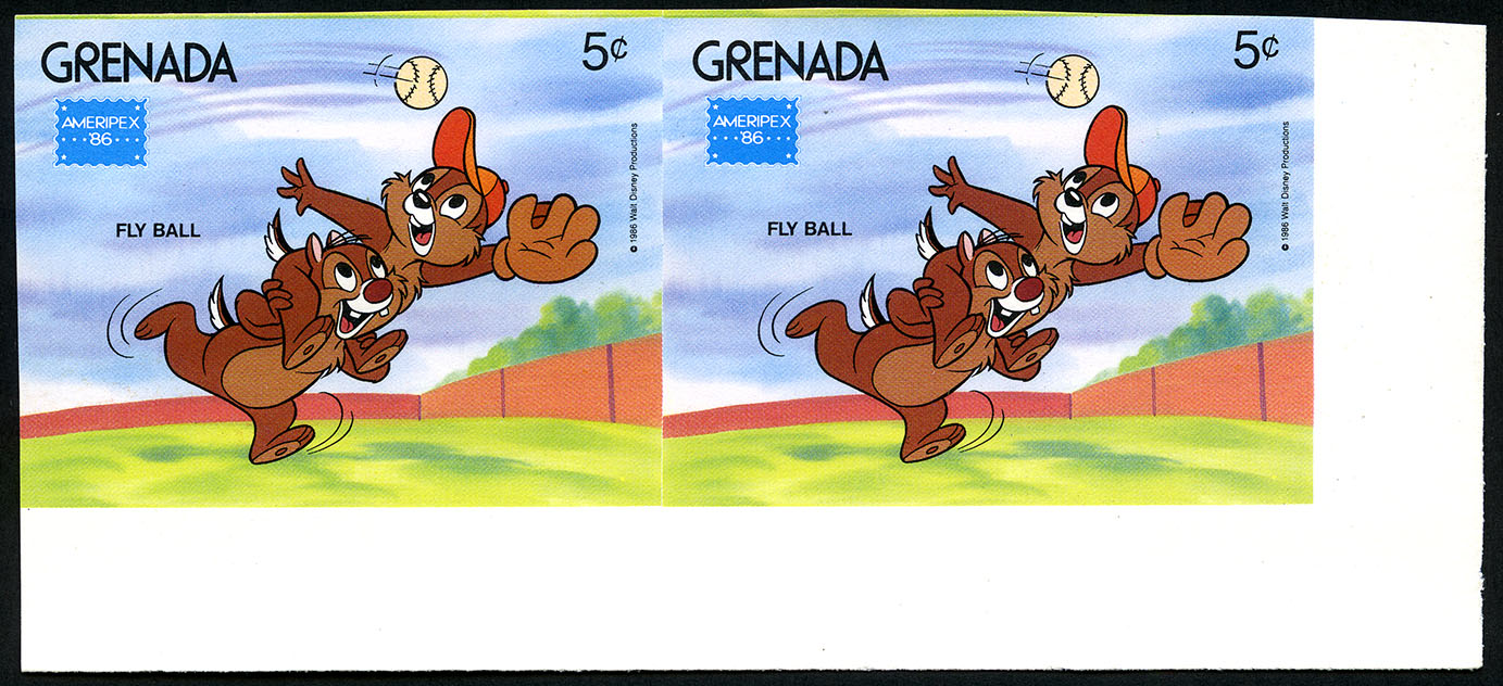 No. Scott: 1379 -- Año de emisión: 1986 -- Valor facial: 5c -- Multicolor -- Con perforación: 11 -- Tipo de Impresión: Litografía. Par de timbres imperforados Chip y Dale tratando de atrapar la pelota. Para más información favor de dirigirse a biblioteca@mufi.org.mx.