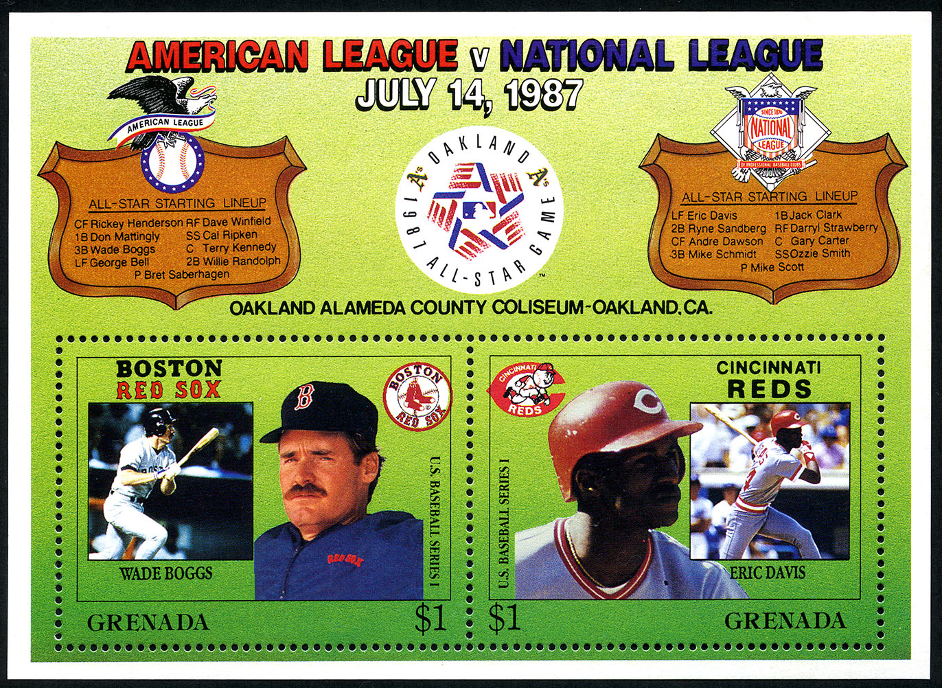 No. Scott: 1552 -- Año de emisión: 1987 -- Valor facial: 2d -- Multicolor -- Con perforación: 13 -- Tipo de Impresión: Litografía. Granada, 1987. Juego de estrellas Oakland. Hoja recuerdo con emblemas de la Liga Americana y la Liga Nacional, y dos timbres: a) Wade Boggs de los Medias Rojas de Boston y b) Eric Davis de los Rojos de Cincinnati. Para más información favor de dirigirse a biblioteca@mufi.org.mx.