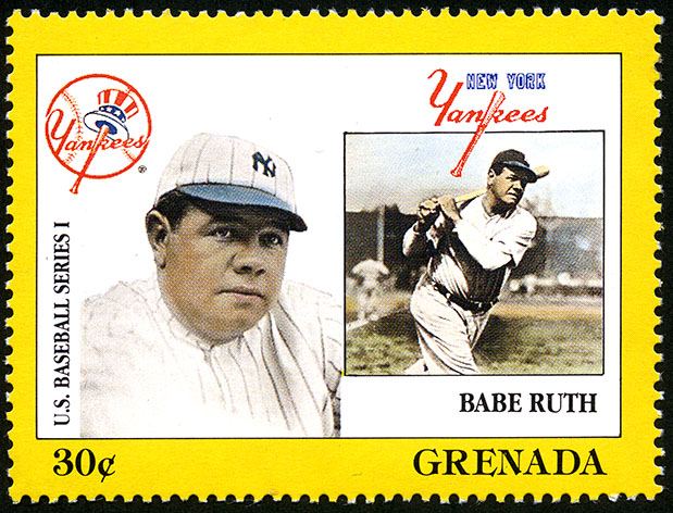 No. Scott: 1665i -- Año de emisión: 1988 -- Valor facial: 30c -- Multicolor -- Con perforación: 14 -- Tipo de Impresión: Litografía. Timbre perforado del profesional beisbolista de Los New York Yankees George Herman Ruth, Jr. Para más información favor de dirigirse a biblioteca@mufi.org.mx.