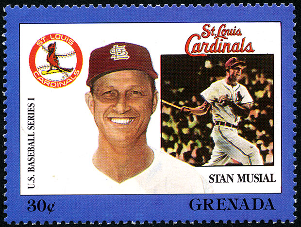 No. Scott: 1668g -- Año de emisión: 1988 -- Valor facial: 30c -- Multicolor -- Con perforación: 14 -- Tipo de Impresión: Litografía. Granada, 1988. Grandes Ligas del Beisbol en timbres. Timbre perforado del profesional beisbolista de los St. Louis Cardinals Stanley Frank Musial. Para más información favor de dirigirse a biblioteca@mufi.org.mx.