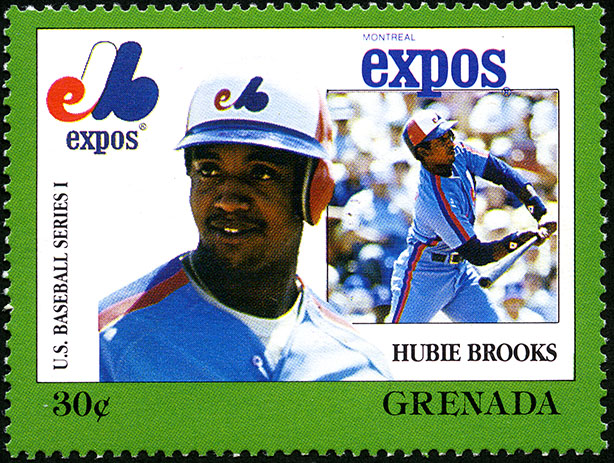No. Scott: 1669h -- Año de emisión: 1988 -- Valor facial: 30c -- Multicolor -- Con perforación: 14 -- Tipo de Impresión: Litografía. Granada, 1988. Grandes Ligas del Beisbol en timbres. Timbre perforado del profesional beisbolista de los Expos de Montreal Hubert "Hubie" Brooks. Para más información favor de dirigirse a biblioteca@mufi.org.mx.