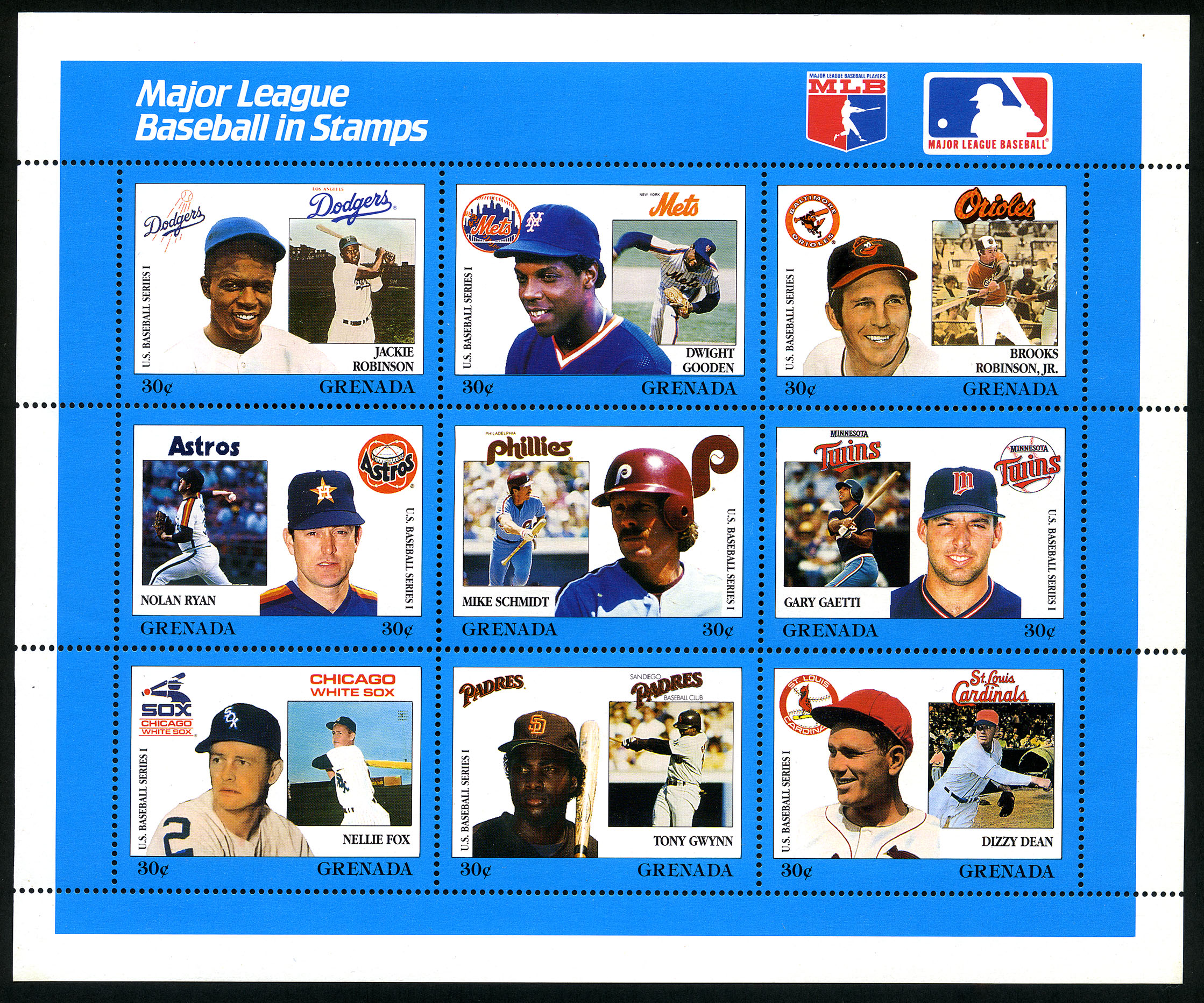 No. Scott: 1666 -- Año de emisión: 1988 -- Valor facial: 9*30c -- Multicolor -- Con perforación: 14 -- Tipo de Impresión: Litografía. Granada, 1988. Grandes Ligas del Beisbol en timbres. Mini planilla de nueve timbres con diferentes jugadores de beisbol: a) Jackie Robinson; b) Dwight Gooden; c) Brooks Robinson Jr.; d) Nolan Ryan; e) Mike Schmidt; f) Gary Gaetti; g) Nellie Fox; h) Tony Gwynn; i) Dizzy Dean. Para más información favor de dirigirse a biblioteca@mufi.org.mx.