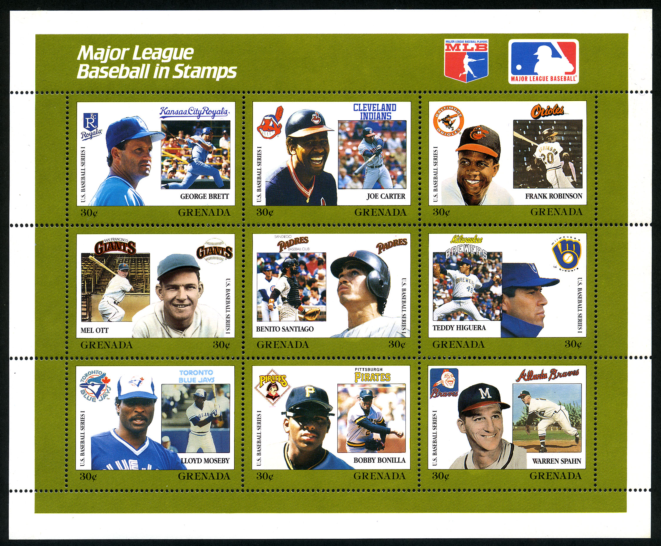 No. Scott: 1670 -- Año de emisión: 1988 -- Valor facial: 9*30c -- Multicolor -- Con perforación: 14 -- Tipo de Impresión: Litografía. Granada, 1988. Grandes Ligas del Beisbol en timbres. Mini planilla de nueve timbres con diferentes jugadores de beisbol: a) George Brett; b) Joe Carter; c) Frank Robinson; d) Mel Ott; e) Benito Santiago; f) Teddy Higuera; g) Lloyd Moseby; h) Bobby Bonilla; i) Warren Spahn. Para más información favor de dirigirse a biblioteca@mufi.org.mx.