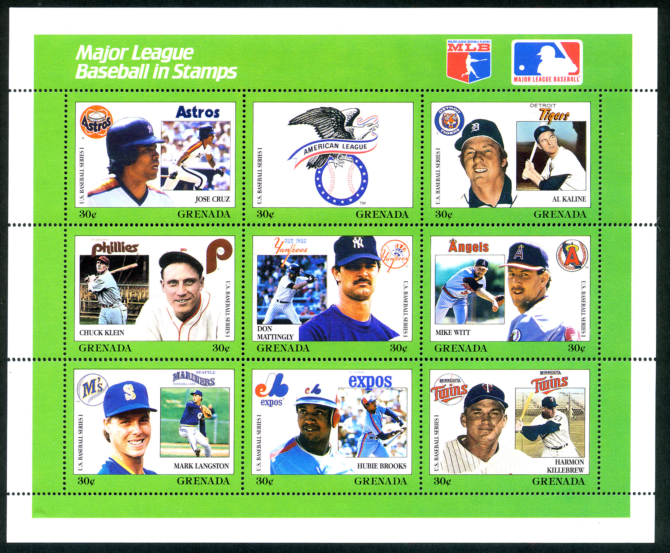 No. Scott: 1669 -- Año de emisión: 1988 -- Valor facial: 9*30c -- Multicolor -- Con perforación: 14 -- Tipo de Impresión: Litografía. Granada, 1988. Grandes Ligas del Beisbol en timbres. Mini planilla de nueve timbres con diferentes jugadores de beisbol: a) José Cruz; b) Emblema de la Liga Americana; c) Al Kaline; d) Chuck Klein; e) Don Mattingly; f) Mike Witt; g) Mark Langston; h) Hubie Brooks; i) Harmon Killebrew. Para más información favor de dirigirse a biblioteca@mufi.org.mx.