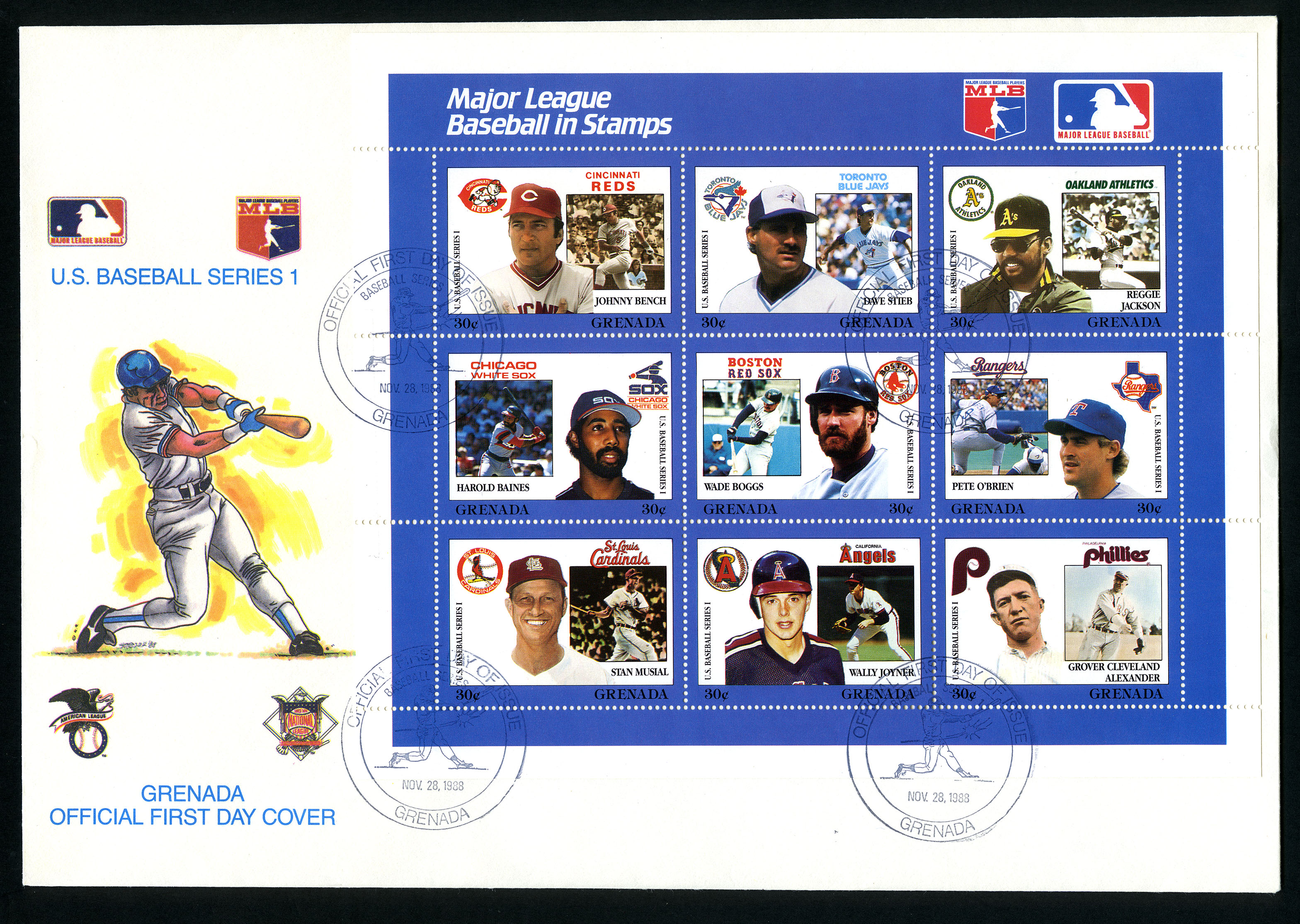 No. Scott: 1668 -- Año de emisión: 1988 -- Valor facial: 9*30c -- Multicolor -- Con perforación: 14 -- Tipo de Impresión: Litografía. Granada, 1988. Grandes Ligas del Beisbol en timbres. Sobre de Primer Día de emisón con sello de cancelación y mini planilla de nueve timbres con diferentes jugadores de beisbol: a) Johnny Bench; b) Dave Stieb, c) Reggie Jackson; d) Harold Baines; e) Wade Boggs; f) Pete O' brien; g) Stan Musial; h) Wally Joyner; i) Grover Cleveland Alexander. Para más información favor de dirigirse a biblioteca@mufi.org.mx.