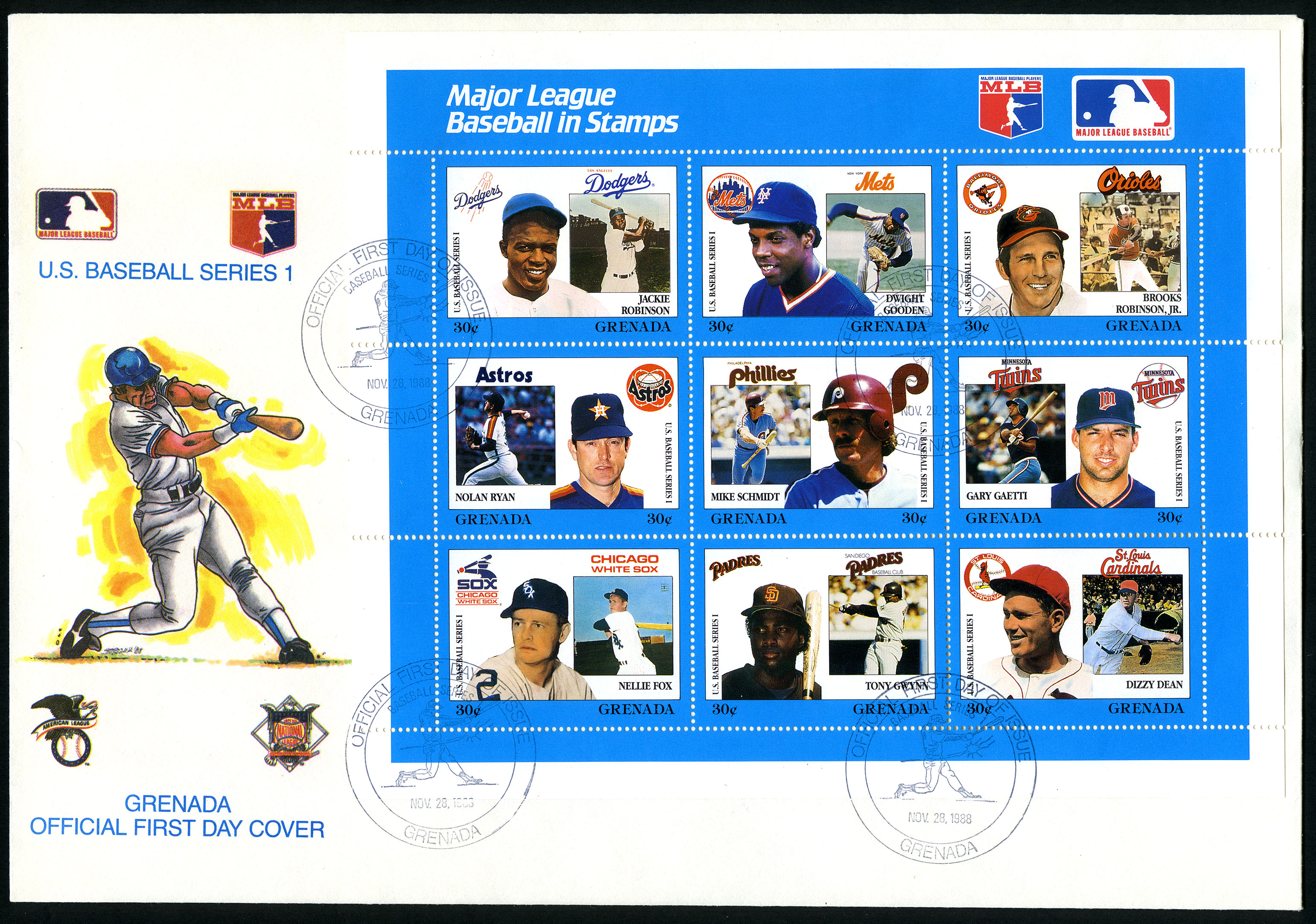 No. Scott: 1666 -- Año de emisión: 1988 -- Valor facial: 9*30c -- Multicolor -- Con perforación: 14 -- Tipo de Impresión: Litografía. Granada, 1988. Grandes Ligas del Beisbol en timbres. Sobre de Primer Día de emisión con sello de cancelación y mini planilla de nueve timbres con diferentes jugadores de beisbol: a) Jackie Robinson; b) Dwight Gooden; c) Brooks Robinson Jr.d) Nolan Ryan; e) Mike Schmidt; f) Gary Gaeth; g) Nellie Fox; h) Tony Gwynn; i) Dizzy Dean. Para más información favor de dirigirse a biblioteca@mufi.org.mx.