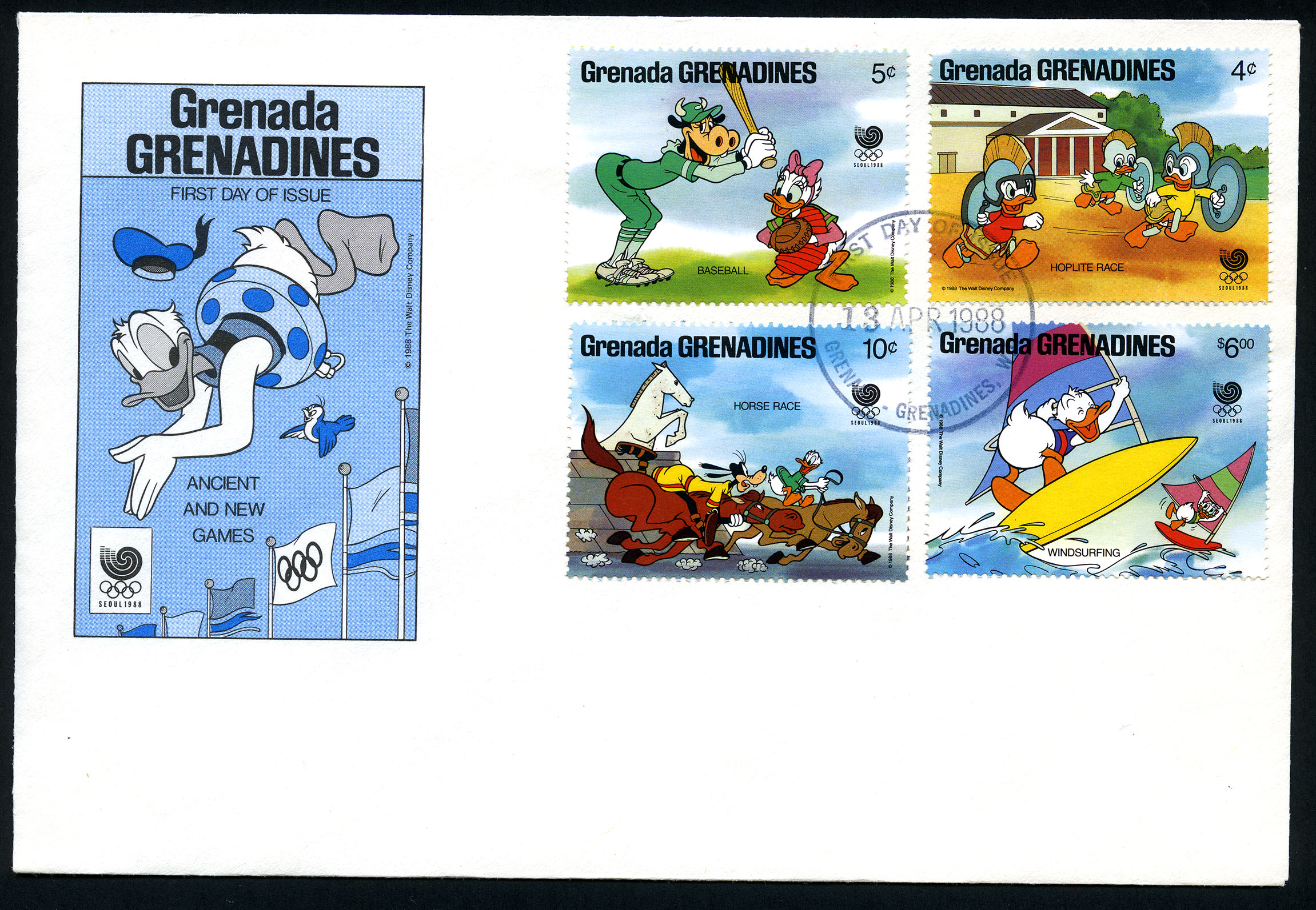 No. Scott: 942, 943, 944, 945 -- Año de emisión: 1988 -- Valor facial: 4c, 5c, 6c, 10c -- Multicolor -- Con perforación: 13 -- Tipo de Impresión: Litografía. Juegos Sobre de Primer Día de emisión con sello de cancelación, ilustración de Donald clavadista y cuatro timbres: a) Clarabella y Daisy jugando beisbol; b) Sobrinos de Donald practicando carrera Hoplita; c) Goofy y Donald en carreras de cababllo; y d) Donald y Daisy practicando velero. Para más información favor de dirigirse a biblioteca@mufi.org.mx.