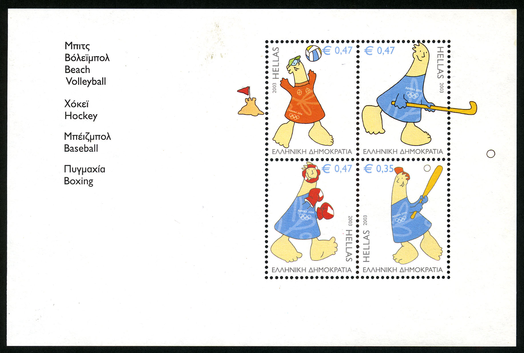 No. Scott: 2069a, 2069b, 2069c, 2069d -- Año de emisión: 2003 -- Valor facial: 35c, 47c, 47, 47c-- Multicolor -- Con perforación: 13 -- Tipo de Impresión: Litografía. Hoja recuerdo promocionando las próximas olímpiadas, con imágenes de las mascotas practicando un deporte: a) Voleibol de playa; b) Hockey; c) Boxeo, y d) Beisbol. Para más información favor de dirigirse a biblioteca@mufi.org.mx.